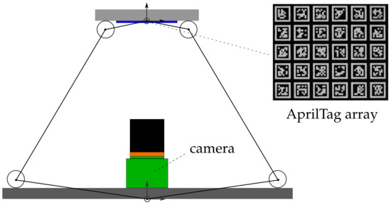 Consider a parallel mechanism where an array of AprilTags is mounted on the bottom side of the moveable manipulator platform. Consider furthermore a camera that is mounted in such a way on the base platform that the camera axis coincides with the z-axis of the base platform. In order to obtain a high position accuracy, the camera’s field of view (FOV) is very small, so that only a section of the AprilTag array is visible. The AprilTags’ sizes are chosen accordingly and they are arranged uniformly on the array in such a manner that, for every pose of the parallel mechanism, at least one AprilTag is completely visible by the camera. Knowing the location of each AprilTag on the array, for example by storing them in an look-up table, and furthermore being able to detect, identify, and compute its pose for any AprilTag that is seen by the camera, it is possible to obtain the parallel mechanism’s pose for every possible pose in the workspace. Figure 4 illustrates this concept.