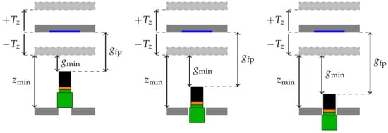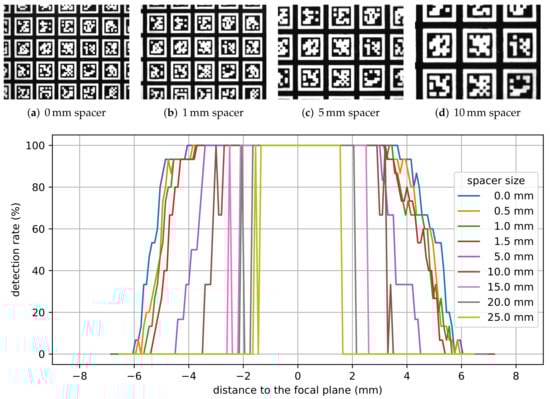 Figure 9a–d show the corresponding fields of view in the focal plane for different spacer sizes when looking at the AprilTag array shown in Figure 8. One can clearly see the magnification of tags. In fact, 15 to 20 AprilTags can be seen without a spacer, whereas only three to six AprilTags are entirely visible in the camera’s field of view when using a 10 mm spacer. Figure 9 furthermore shows the influence of the spacer size on the detection rate of AprilTags for different distances to the camera’s focal plane. A detection rate of means that every AprilTag that is visible in the camera’s field of view is detected, whereas lower detection rates indicate that one or more AprilTags were not detected properly. Due to the camera’s depth of field, for increasing distances to the focal plane, the detection rate should decrease. It can be noticed that, for wider spacers, the detection rate deteriorates for lower distances than for smaller spacers. In fact, while the detection rate is still for the camera system without a spacer for distances ±4 mm to the focal plane, for the camera system with the 10 mm spacer, the detection rate is already at at this distance. With this spacer, detection rate of is only possible within ±3 mm to the focal plane.