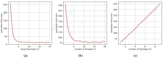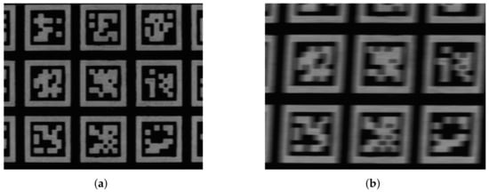 The AprilTag algorithm that suits best for calculating the hexapod’s pose from the AprilTags’ corner points has several parameters. Among others, these are the QD (quad decimate), NT (number of threads), and the number of AprilTags in the field of view. To investigate the influences of these parameters on the sampling rate, they are systematically varied. Here, only one picture is used for every experiment. Originally, nine AprilTags are visible in the image. To reduce the number of visible AprilTags, image editing software was used to remove the desired number of AprilTags. The images are shown in Figure A1.