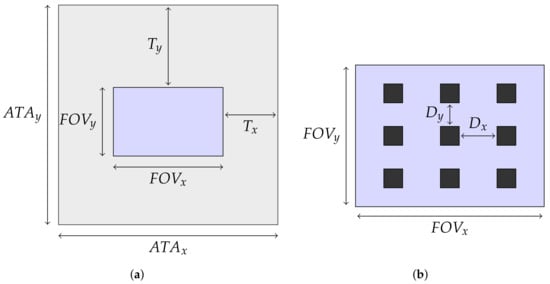 Graphical representation of the camera’s field of view (blue), the AprilTag array (gray), AprilTags (black), and their arrangement in the the camera’s field of view: (a) Parameters determining array dimensions, and (b) AprilTag arrangement.