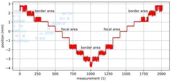 Due to the camera’s depth of field, AprilTags in the focal area are detected more accurately than AprilTags in the border area. The border area is the area with a distance to the focal plane where the detection rate starts to deteriorate but AprilTags are still detected. Consequently, the parallel mechanism’s pose is estimated to be less accurate in the border area than in the focal area. Figure 10 shows the estimated poses for a staircase motion in z-direction where AprilTags are detected in the border area as well as in the focal area. It can be noticed that the poses in the border area are significantly more noisy than in the focal area. Furthermore, not all AprilTags were detected (indicated by missing measurements).