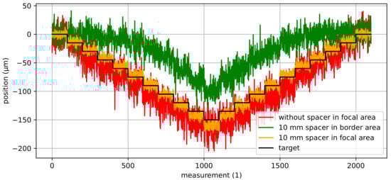 Figure 11 shows a comparison of the estimated poses without and with a 10 mm spacer for a staircase motion in the focal area in z-direction with a step size of 15 µm. It can be noticed that the pose estimates from the camera system with the 10 mm spacer are significantly more accurate compared to the ones without a spacer. In fact, with a 10 mm spacer, the measurement noise is three times lower than the noise without a spacer. Consequently, the mean values are much closer to the target values for the camera system with the 10 mm spacer. As the camera’s depth of field also influences the results, the estimated poses with a 10 mm spacer in the border area are additionally shown in Figure 11. The estimated poses with a 10 mm spacer in the border area have similar noise compared to the poses obtained without a spacer in the focal area. However, the position accuracy is significantly worse. In fact, neither the staircase motion nor actual steps can be identified with certainty.