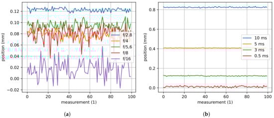 To investigate the influence of illumination on the detected distance in z-direction, the hexapod is covered with a box to measure under homogenous lighting conditions. The hexapod pose is held at a constant position and the distance is calculated via PnP algorithm. As constant position, the hexapod’s home position is used. The exposure time and the aperture stop are varied systematically to investigate their influence on the measured z-direction. For each measurement setup, 60 images were taken.