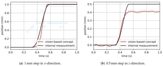 In the application part of this section, the influence of the PnP algorithm on the pose accuracy is investigated. Therefore, a staircase motion in x-direction with a step size of 0.5 µm is performed with the hexapod, and for every step, 100 images were taken. The AprilTags’ corner points were extracted in pixel coordinates and passed to the presented algorithms with the corresponding object points that were stored in a look-up table. From this, the hexapod’s pose is calculated.