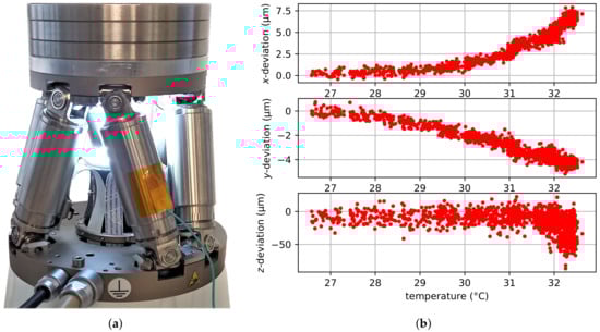 Similar to backlash, temperature drift is a critical issue that cannot be measured with the internal measurement system. The same applies to the drift caused by mechanical stress. The main sources for temperature drift are ambient temperatures and heat caused by the motors, the drives, and the control. Depending on the materials and the length of the active joints, the temperature drift in the parallel mechanism’s pose can reach several micrometers. See, for example, [31], where a position drift of over 200 µm was obtained after eight hours for a hexapod with linear actuator lengths of 2860 mm. Temperature drift can be modeled and compensated if the heat source, the produced heat, and the materials’ thermal expansion coefficient are known. Kalas et al. [32] proposed a method to eliminate the influence of thermal deflection by measuring the temperatures of every linear actuator at a reference pose and predicting the thermal expansion of the platform.