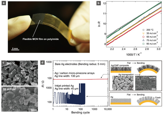 - Nakajima, T.; Hanawa, S.; Tsuchiya, T. Highly stable flexible thermistor properties of spinel Mn-Co-Ni oxide films on silver/carbon micro-pinecone array composite electrodes. J. Appl. Phys. 2017, 122, 135309. [Google Scholar] [CrossRef]