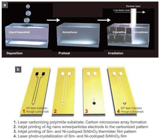 - Nakajima, T.; Tsuchiya, T. Flexible thermistors: Pulsed laser-induced liquid-phase sintering of spinel Mn-Co-Ni oxide films on polyethylene terephthalate sheets. J. Mater. Chem. C 2015, 3, 3809–3816. [Google Scholar] [CrossRef]