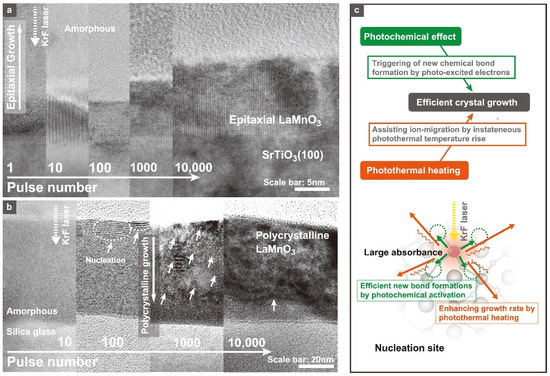 - Nakajima, T.; Tsuchiya, T.; Ichihara, M.; Nagai, H.; Kumagai, T. Epitaxial growth mechanism for perovskite oxide thin films under pulsed laser irradiation in chemical solution deposition process. Chem. Mater. 2008, 20, 7344–7351. [Google Scholar] [CrossRef]