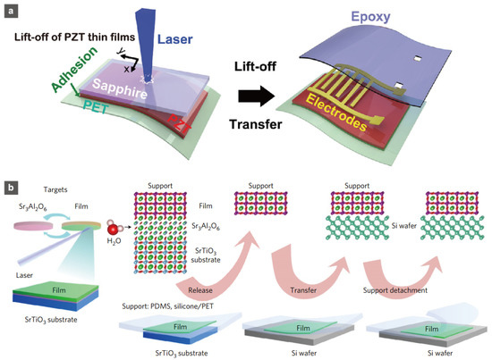 - Lu, D.; Baek, D.J.; Hong, S.S.; Kourkoutis, L.F.; Hikita, Y.; Hwang, H.Y. Synthesis of freestanding single-crystal perovskite films and heterostructures by etching of sacrificial water-soluble layers. Nat. Mater. 2016, 15, 1255–1260. [Google Scholar] [CrossRef] [PubMed]
