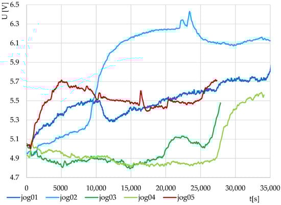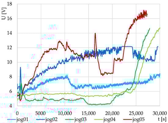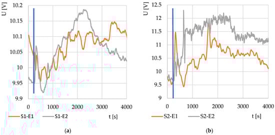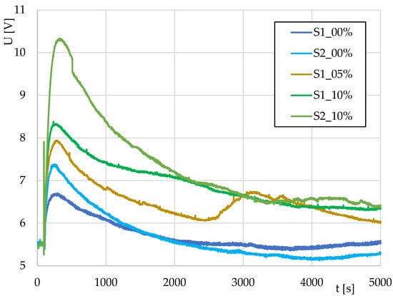 Thermodynamic systems S1 and S2 were tested on a model solution of baker’s yeast in water with sugar. The results of the two tests are shown in Figure 3. The different output voltages are due to the different design characteristics of the systems.