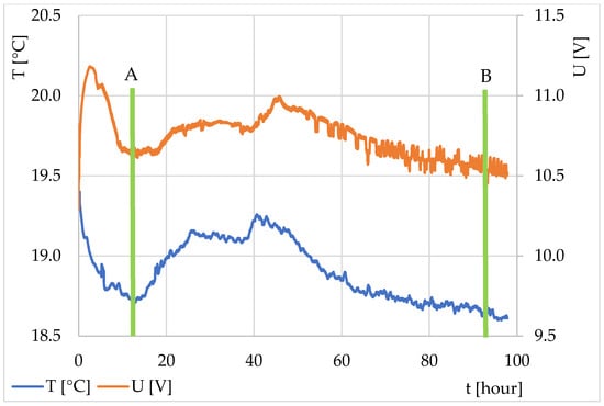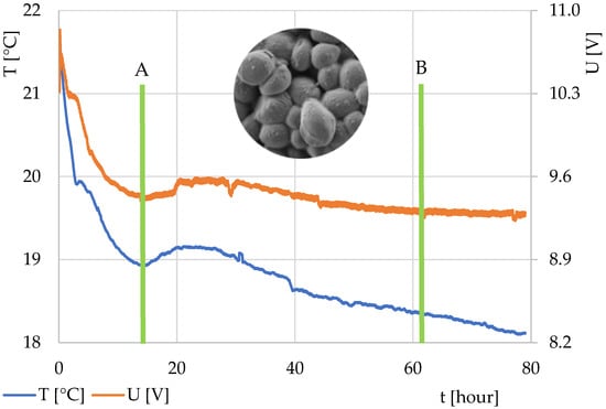 In the second part of the work, attention was focused on beer fermentation. The resulting characteristics from the two experiments are shown in Figure 5 and Figure 6. The experiments differed in yeast preparation (Experiment No. 1—yeast tempered to ambient temperature; Experiment No. 2—yeast directly from the refrigerator). The graph in both the experiments began with a decrease, which shows wort cooling and temperature stabilization (equalization of the temperature flow from and to the fermentation mixture, including equalization of the wort temperature and the fermentation batch). The moment at the end of the decrease and the beginning of the rise in the thermodynamic sensor output voltage (in orange in the graph) documents the change in the internal thermal activity and marks the beginning of the fermentation process and an increase in the temperature in the mixture. Alternatively, it might have also meant that the surroundings started to cool down. However, because the entire system was closed and thermally insulated from the environment, this case was not considered. A conventional thermocouple was connected to the outside of the fermentation vessel, the temperature of which is marked in blue in the graph.