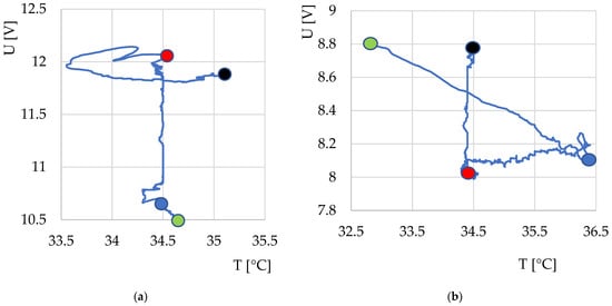 Courses of output voltage and temperature dependences during fermentation monitoring using thermodynamic system S1 for: (a) yoghurt without additives; (b) yogurt with the addition of insect flour. Description of points: green, start of measurement; blue, insertion of yogurt culture into milk or milk with additives; red, 6 h after the start of measurement (expected time of end of fermentation); black, end of measurement.
