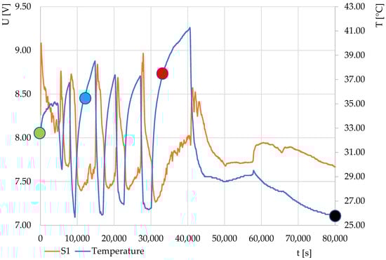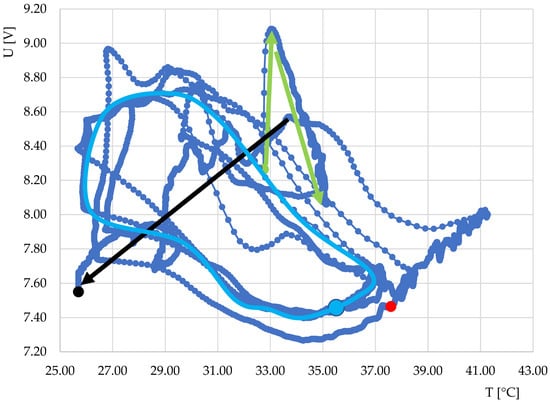 Due to the interesting nature of the above curves, the fermentation process in the production of yogurt was monitored, during which the temperature was changed by switching the heating element on and off in the experimental equipment. The resulting course is shown in Figure 10. From the initial data, the characteristics of the output response of sensor S1 during the course of monitoring depending on the change in the heating temperature and the course over time were obtained. The dependence of the output voltage on the temperature is shown in Figure 11. The course of the characteristics shows that after temperature stabilization (marked in green), the characteristics occurred in a loop with a negative direction (indicated by a light blue color). However, after the fermentation, the characteristics changed and the direction changed to positive.