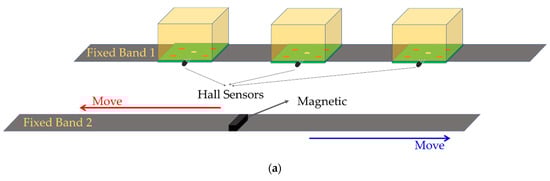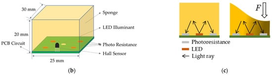 The structure diagram of the developed sensor is shown in Figure 1. As shown in Figure 1a, the sensor consists of three flexible deformation sensor modules and one magnet, which are fixed on two cloth tapes. The distance between the three flexible deformation sensor modules can be adjusted to accommodate different users. Meanwhile, the flexible deformation sensor module consists of a circuit board, an LED illuminant, a Hall sensor, an elastic transparent sponge, and four photoresistors; the basic structure is shown in Figure 1b. While its total size (length × width × height) is 30 mm × 25 mm × 20 mm, the four photoresistors are covered by the light-permeable foaming sponge, and the density of the sponge, which affects its transmittance, is increased or recovered via the squeezing and relaxing from the arm muscle. Moreover, the sensing principle of flexible deformation is shown in Figure 1c. The sensing principle is based on the photoelectric effect, where the photoresistor shows different resistance characteristics under different light intensities, which is affected by the density of the sponge. Therefore, based on the optical properties, the amount of deformation of the arm muscle can be detected by changes in each photoresistance value.