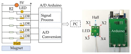 The detection circuit and signal process of each flexible deformation sensor module are shown in Figure 2. We detected the deformation and finally converted it to the voltage as the sensor output. Specifically, as shown in Figure 2, we utilized the partial voltage principle to detect the photoresistance value by measuring its voltage. Specifically, the photoresistance was connected to a DC circuit in series with constant resistance. When the value of the photoresistance changes, its voltage also changes according to the partial voltage principle. Each flexible deformation sensor module was powered with a 5 V DC power supply, in which the four photoresistances were held in parallel to ensure the voltage consistency, with a resistor R2 in series with a light-emitting diode (LED) functioning in parallel with the four photoresistances to supply illumination for them.