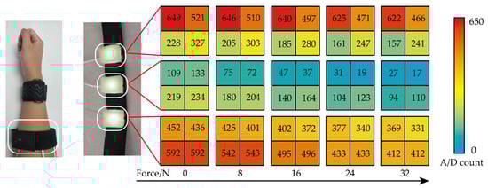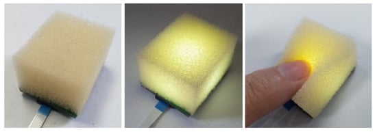 Our developed sensor utilized the sponge as the flexible deformation material, which was particularly sensitive to the slight deformation in the arm muscle and could perfectly fit with the user’s arm, as shown in Figure 3. In addition, the sponge density enlarges or recovers when it is squeezed or relaxed, and the size of density is positively associated with the deformation degree of extrusion. Equally important, as a common material with low cost, the sponge is very comfortable and does not harm the human body. Especially, we chose a sponge with an initial density of 35 d as our selected deformation material by a series of tests to enhance sensor performance to the maximum. The sponge was cropped to a size of 30 mm × 25 mm × 18 mm in length × width × height and stuck to the sensor circuit board by sponge-specific glue. Figure 3 shows the front sides of the fabricated unit sensors, and the status of the sensors with power and with squeezing.