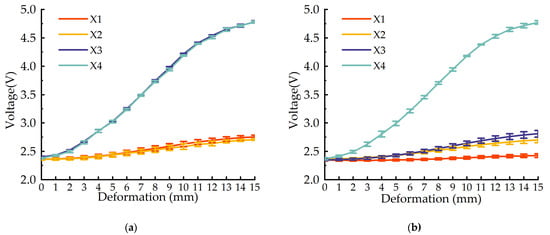 The experiment results are shown in Figure 5, where Figure 5a shows the results from the X4 point being extruded and Figure 5b shows the results from X3 and X4 points being extruded. As shown in Figure 5, the sensor output voltage responds well to deformation and has a great sensitivity to the deformation. The two sets of experiments show that the sensor has a better consistency, and the repetition accuracy is less than or equal to 1.00%. The deformation characteristics show that there is a nonlinear relationship between the sensor output voltage and deformation quantity, which is determined by the characteristics of the foaming sponge itself.