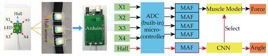 In this section, the method for grip strength estimation based on the developed flexible arm muscle deformation sensor is introduced. The diagram of the grip strength estimation system is shown in Figure 6. The estimation system contained a single-chip computer module, a PC module, and a power supply device. The resistance value of the photoresistor and Hall signal obtained by the sensor were collected by the ADC built-in single-chip computer. After acquisition, the signal was filtered by a moving average filter (MAF) with a window size of 6. The processed signal was sent to the CNN and muscle model.