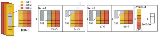The TSCNN consisted of two main parts: sampling processing in the time dimension and convolutional neural network. The time dimension consisted of the input layer and reconstruction layer, while the convolutional neural network consisted of the convolution layer, maximum pooling layer, and classifier layer. A dynamic window was adopted to sample and stitch the one-dimensional vector data detected by the three sensors, which can expand the valuable feature information of the Hall sensor in the time dimension. The sampling processing sampling network structure mainly included the input layer and the reconstruction layer, as shown in Figure 7.