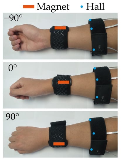As the grip strength is related to the angle of the wrist, as shown in Figure 6, to increase the sensor’s application scenario with an increased estimation accuracy, we predicted the grip force at different wrist angles. Thus, we first detected the wrist angle by the three Hall sensors on the sensor while fixing a magnet on the wrist.