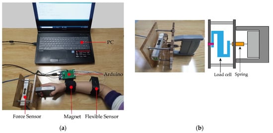 In our study, to realize the continuous estimation of grip strength, we derived a novel grip strength-forearm muscle model aimed at the healthy human based on the relationship between the forearm muscle’s deformation and grip strength. To derive and validate our derived model, the overall test detection appearance is shown in Figure 9. The designed flexible deformation sensor was fixed on the arm to collect the muscle deformation information of the arm. A magnet was fixed to the wrist that can change its position as the wrist rotates and can be detected by a Hall sensor on the flexible deformation sensor. Handgrip information was obtained using the HX711 force sensor shown in Figure 9b. It can measure the grip strength at different wrist angles. Considering that the study aimed to restore the grip control of the handicapped, the maximum sampling range of the grip meter was 35 N, which was able to accomplish most of the daily tasks such as holding cups, books, and fruits. All information was collected by an Arduino and sent to the PC for information processing.