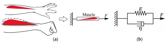 Considering the relationship between muscle deformation and grip strength, the viscoelastic characteristics of the muscle were used as a function of handgrip force and muscle deformation. Therefore, the Voigt muscle model was used to describe the relationship between muscle deformation and grip force, which is based on the Hill muscle model and includes viscous and elastic elements. To apply muscle characteristics to the handgrip, the actual forearm was abstracted into a mechanical model, as shown in Figure 11a. When a person controls the strength of the hand, the arm muscles contract lengthwise, which results in muscle deformations. The skin surface changes as the muscle deforms in the direction of contraction. We assumed that the input muscle deformations of the function and the output grip force of the function correspond to the viscoelastic model of the muscle.