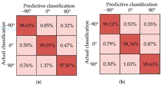 where represents the normalized value, represents the value of sample data, represents the minimum value of one line of data, and represents the maximum value of a row of data. Finally, the dataset was manually added to the angled label and fed into the neural network for training. To verify the effectiveness of the convolutional neural network model, the dataset was trained and tested, and the dataset was divided into the training set and test set in a ratio of 4:1. To clearly show the accuracy of the model in identifying three wrist angles, the identification confusion matrix was drawn, as shown in Figure 12. It can be seen that the recognition accuracy rate of the model for three wrist angles is above 97%. It can be seen that the model established for specific people has a high recognition rate and usability.