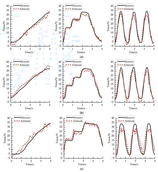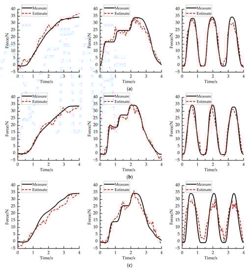Relationship between measured grip strength and estimated grip strength of subject A. (a) The relationship between the measured grip strength and the estimated grip strength when the wrist angle of subject A is 90°. (b) The relationship between the measured grip strength and the estimated grip strength when the wrist angle of subject A is 0°. (c) The relationship between the measured grip strength and the estimated grip strength when the wrist angle of subject A is −90°.