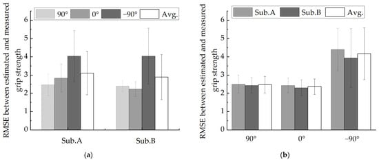 where is measured grip strength, is estimated grip strength, and is the sampled times. In this study, RMSE analysis was performed on each subject at different wrist angles. Figure 13 and Figure 14 show the time series of measuring and estimating the grip strength of two subjects in the experiment under three different wrist joints. The average RMSE between the measured and estimated grip strength of subject A is 3.11 ± 1.19 N, and that of subject B is 2.89 ± 1.24 N. Figure 15a shows the RMSE of two subjects under different wrist joints. Figure 15b shows the RMSE of two subjects at different joint angles. The time series of grip strength shows that the estimated grip strength is in good agreement with the measured grip strength. When the angle changes rather than remains stable, the estimation is more accurate. In the experiment, it is found that the RMSE of the wrist angle is small when the wrist joint is 90° (RMSE = 2.467 ± 0.456) and 0° (RMSE = 2.367 ± 0.423), and it increases when the wrist joint is −90° (RMSE = 4.167 ± 1.39257). We think that the reason for this is that when the wrist angle is −90°, the arm rotation angle of the human body is large, which will make the human hand feel uncomfortable to a certain extent when exerting force, which will lead to a certain deviation in the result.