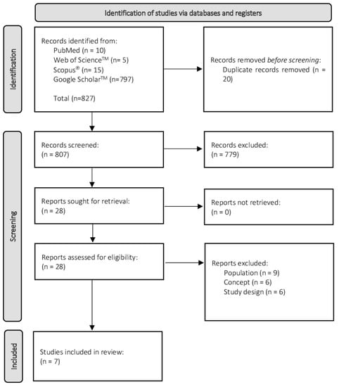 The search identified 827 potentially relevant studies, 10 from PubMed, 5 from Web of Science™, 15 from Scopus®, and 797 from Google Scholar™. After removing 20 duplicated records, 807 remained, of which 779 were excluded after screening the title and abstract. Over the 28 lasting, 21 studies were excluded after full-text reading, as they did not address the proposed questions for this review. The remaining seven studies fulfilled the established criteria.