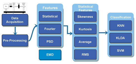In this section, the digital signal processing (DSP) techniques that are used for feature extraction are discussed. These techniques can be categorised under three main headings, the statistical features of time domain signal, the statistical features of signal in Fourier domain and the statistical features of signal’s Power Spectral Density. The raw vibration data was used to extract statistical features like maximum value, minimum value, standard deviation, mean, median, variance, skewness, kurtosis, range, Fisher Information Ratio [51,52], Petrosian Fractal Dimension [51], and entropy. The results of skewness, kurtosis and standard deviation and second derivative and so forth, to name a few. The features that were selected are mean value, standard deviation, skewness, kurtosis and second derivative. These features were calculated for time domain vibration signal, for the signal in Fourier domain and for the same signal after calculating its PSD. These features were then fed to the SVM, KNN and KLDA algorithms for classification into outer race fault, inner race fault, and ball fault as given in the block diagram of Figure 1. As is shown, the raw data are extracted, pre-processed and its statistical features like skewness, kurtosis, average and RMS values are calculated. It is important to note that extracting these statistical features in the Fourier domain and from the PSD of the vibration signal is not used previously, to the best of our knowledge. This proposed method has also reduced the number of data points and hence computational requirements as discussed in Section 4. The vibration signal of healthy and faulty bearings were recorded, using vibration sensors, shaft rotating at a rate of 800 revolutions per minute and a sampling rate of 40,000 samples per second. Figure 2 shows the specifications and block diagram of the test rig with ball bearing model, fault types and specifications of the data acquisition board.