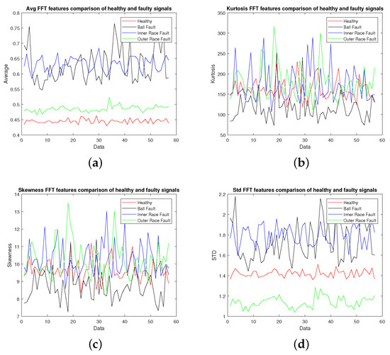 FFT signal demonstration: (a) Average, (b) Kurtosis, (c) Skewness, (d) Standard Deviation.