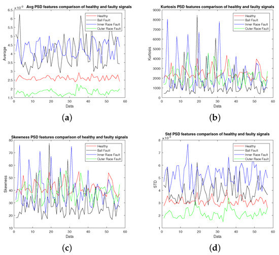 PSD signal demonstration: (a) Average, (b) Kurtosis, (c) Skewness, (d) Standard Deviation.