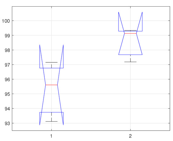 For the proposed scenario, we are considering two different classifiers ( & )—selected on the basis of their improved classification results. In ANOVA, multiple tests are performed for the presumption of homogeneity of variance and normality. A Bartlett’s test is performed to verify the homogeneity of variance, whereas the Shapiro–Wilk test is performed to check normality. The significance level is selected to be 0.05, which indicates if the test value found greater than then data would be normally distributed and vice versa. The means for the given samples are represented by , which are calculated by performing the Monte-Carlo simulations to identify the lower and upper bounds after simulated 500 times. The null hypothesis claims that for the given means , whereas the alternative hypothesis claims the rejection, . To test the null hypothesis, , p-value is calculated—conceded that the rejection fulfils the relation, , otherwise, the Bonferroni post-hoc test will be performed [60].