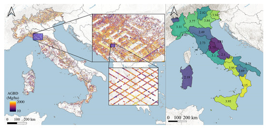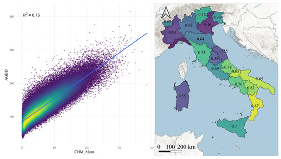 Left—scatter plot of aggregated AGBD and CHM with the blue line showing the linear correlation. Right—a map indicating the different correlations for each Italian region.