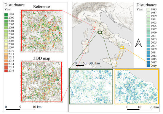 Remote sensing holds a relevant part in forest monitoring, as disturbance maps can be predicted using automatic procedures and optical sensors images. Accordingly, in this contribution, we used Landsat BAP composites [55] and the 3I3D algorithm [19] to predict almost 2 million forest disturbances that occurred in Italy in the period 1985–2019. An in-depth performance evaluation of the 3I3D algorithm is presented in Francini et al. [19,20]. Commission errors reported in this paper are overestimated because 3I3D predicts several forest disturbance, while the reference dataset includes just forest harvestings. Similarly, as previously demonstrated [15,56], most omission errors coincided with forest disturbance correctly predicted, but with slightly smaller boundaries. To overcome this issue, a reference dataset of sample points may be preferred to polygons [20]. Either way, as expected, Landsat data provided crucial information on forest disturbances across the whole of Italy over a historical period of about four decades (Figure 4). The key years 1985 and 1990—characterized by very intensive frost events [76]—and 2017—characterized by several forest fires [77,78]—were correctly predicted as the years with the largest forest disturbance areas (Figure 5).