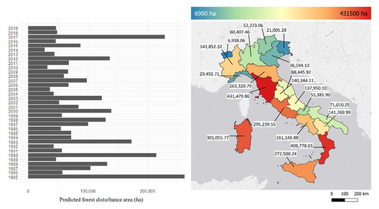 Per year area of forest disturbance predicted in Italy. On the right, the overall disturbance area is shown per region.