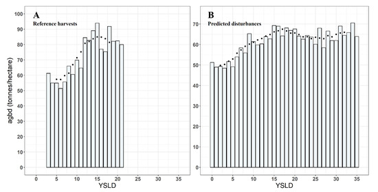 There were 1,080,483 GEDI pulses acquired over mapped forest disturbances. The number of pulses acquired yearly over forest disturbance ranged between 84,505 (for forest disturbances occurred in 2017) and 10,272 (for forest disturbances occurred in 2010). We found that the AGBD median values ranged between 48 t ha−1—on 3 YSLD—and 70 t ha−1—on 34 YSLD. Several oscillations in the AGBD values were recorded over time (Figure 6), but in general, AGBD in the reference forest harvestings (Figure 6A) increased more rapidly than in the predicted forest disturbance (Figure 6B), overtaking 80 t ha−1 in 11 YSLD. These results are congruent with the data provided by [74]. In both reference harvestings and forest disturbance, the AGBD does not increase after 15 YSLD. The average of the AGDB between 13 and 17 YSLD was 94 t ha−1 in harvested areas and 69 t ha−1 considering all disturbances.