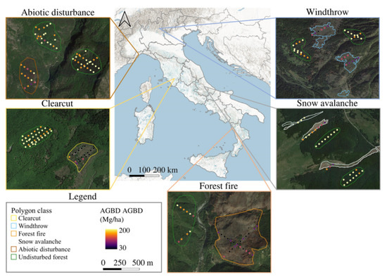 Finally, an in-depth evaluation of AGBD to forest disturbance would require automatic forest disturbance characterization using remote sensing imagery [82]. On the other hand, it remains challenging to identify the disturbance type automatically [38], and—despite several attempts [2,56,59,83]—optical sensors do not allow good accuracies yet. This is especially true for Italian-managed forests, where natural disturbances are often superimposed by a management signal. An additional issue is that a precise, clear, and unique definition of forest disturbance is missing. For example, while FAO defines forest degradation as “the reduction of the capacity of a forest to provide goods and services’’, it is more than challenging to match this definition with forest disturbance products that can be derived with remotely-sensed data. On the other hand, such products are often the only ones available over large and remote regions of the globe. Furthermore, most ecologists tend to exclude natural disturbances from those which cause forest degradation [84], since natural disturbances can be considered part of forests’ life cycle. However, such alterations have the potential to profoundly impact the ability of forests to provide ecosystem services to society over the years. Similarly, climate-driven change in disturbance regimes could exceed the capacity of forests to regenerate. Even if forest ecosystems are well known for their high resilience capacity, this applies only to long-term changes in environmental conditions. Due to their long lifespan, trees are vulnerable to sudden changes because their ability to adapt rapidly is limited [8]. Therefore, changing natural disturbance regimes might have detrimental consequences for the functioning and services of Europe’s forests, and monitoring natural disturbances is thus of high importance.