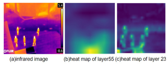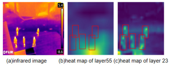 Heat map analysis. Figure (a) shows the infrared image used for visualization, Figure (b) shows the heat map obtained from network layer 55, and Figure (c) shows the heat map visualized from network layer 23, with the area beyond the pedestrian in the figure as the background area. The red boxes are manually labelled true value boxes.