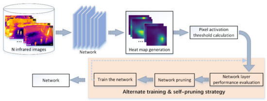 This paper proposes a pruning method for deep convolutional network based on heat map generation metrics, which can be applied to the pruning of network structures in different domain’s network to achieve the extraction of key features in different datasets. Network layer’s performance evaluation metrics, including F, B and mNPE, are proposed for evaluating the network layer performance and pruning the network layers with poor performance. An alternate training and self-pruning strategy is proposed. Reducing the occurrence of incorrectly judged network layer performance due to interference from pre-trained model parameters. The experimental results show that the network pruning method not only improves the network operation speed, but also the performance of the object detection task as the network layers that extract redundant features are pruned to extract key features in the infrared images and retain the high-level semantic information and shallow detail information in the infrared images. In this paper, the mean value of pixel points in ground truth is compared with the pixel point activation threshold to determine whether pedestrians are extracted or not. However, ground truth generally contains more pixel points than pedestrians, and therefore contains some redundant pixel points. In the next step, a Gaussian distribution will be applied to label the pedestrian area. The mean value of the pixel points in the pedestrian area is then calculated instead of calculating the mean value of the pixel points inside the ground truth. In the future, the application of this method will be extended to validate the application to depth images and improve the generality of the pruning method.