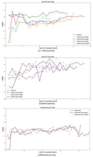 Network pruning process: The horizontal coordinate in Figure 6 is the residual block number and the vertical coordinate is the comprehensive evaluation index of the residual block. This is used to evaluate the performance of this residual block. A higher mNPE value indicates a better residual block performance, i.e., more critical information can be extracted. Each line represents a pruning model. Yolov4 in Figure 6a indicates the evaluation of 23 residual blocks of yolov4, and each node indicates the evaluation result of the corresponding residual block. The first residual block was found to be the worst performing in the yolov4 residual block evaluation results. Yolov4 pruning1 indicates the worst performing residual block in the pruned model of yolov4. Since the first residual block in the yolov4 residual block evaluation curve has the worst performance. Therefore, the first residual block in the yolov4 model needs to be pruned. Yolov4 pruning1 is the first residual block to be pruned on top of yolov4. Yolov4 pruningN is the worst residual block to be pruned in the yolov4 pruningN-1 model. Yolov3 and retinanet networks are pruned in the same way.