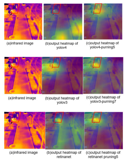 We found that the map value of the object detection model generally decreased when the pruning rate reached 30% through several groups of experiments. Therefore, we believe that a pruning rate higher than 30% is not useful for improving the feature extraction ability of the network. Therefore, we chose to adopt an equal interval approach to select the pruning rate with a 30% threshold, and adjusted the pruning rate according to the different performance of the network. Yolov4 pruning rates were set to 10%, 15%, 20% and 30% in turn. Yolov3 pruning rates were set to 10%, 20% and 30% in turn. Retinanet pruning rates were set to 10% and 20% in turn. In Figure 6a–c shows the pruning process of yolov4, yolov3 and retinanet networks, respectively. From the Figure 6, it can be seen that when the yolov4, yolov3 and retinanet pruning rates are 15%, 30% and 10%, respectively, i.e., yolov4_pruning5, yolov3_pruning7 and retinanet_pruning5, the mNPE values of the network are all higher. The performance of the network is best at this time. Figure 7a–c shows the final feature map visualization results for each network before and after pruning, respectively. Based on the visualization results, it can be observed that the pruned networks extract more pedestrian features than the pre-pruning networks. Therefore, the proposed network pruning metrics and pruning strategy are more accurate in pruning the network structure that extracts redundant features. The performance of the networks in performing each task is also improved.