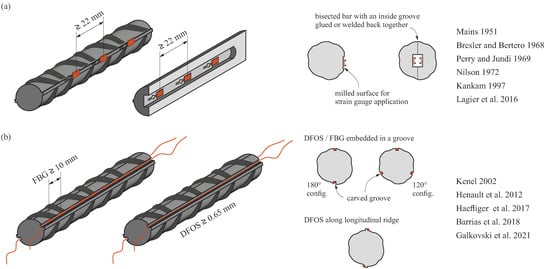 Methods to directly assess the strain distribution of reinforcing bars embedded in concrete (as examples without claiming completeness): (a) strain gauges glued on and inside a reinforcing bar [1,2,3,4,5,6]; and (b) fibre optical sensors installed on a reinforcing bar using either fibre Bragg gratings (FBG) [10] or Distributed Fibre Optical Sensing (DFOS) [14,18,24,28].