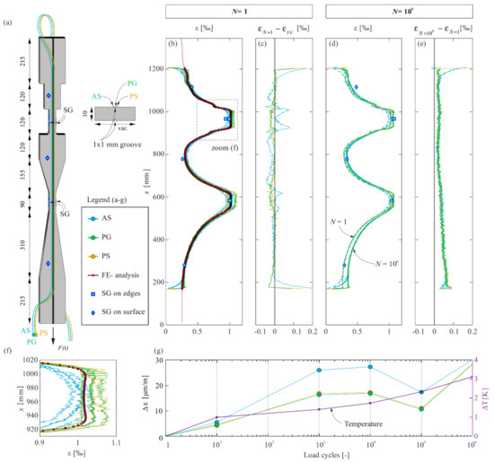 Figure 2d shows the strain profile at the upper load at the first and the millionth cycle. The strain profiles were similar, and none of the DFOS configurations displayed anomalous values. Thus, the applied load cycles did not affect the measurement quality. However, a shift in the strain profiles was observed. The difference between these strain profiles is shown in Figure 2e. The strain difference was almost uniform in the upper part (x > 700 mm) and increased gradually toward the lower end. To investigate the reason behind this small but non-negligible change, the development of the strain difference at around x = 967 mm over the load cycles was studied. Figure 2g compares the development of strain differences at this point of all configurations to the ambient temperature change. Both PG and PS displayed a strain difference of approximately 28 μm/m from the first to the millionth cycle, which corresponds to a temperature change of 3.4 K (assuming an expansion coefficient of 8.32 10−6 K−1 based on the ODiSI-A user guide [37]), whereas AF exhibited a slightly higher value of 3.6 K. These values correspond well with the measured ambient temperature difference of 3.1 K at N = 106, as well as with the variation over the cycles. The reason for the gradient in along the specimen might be that the repeated loading caused the piston, which was situated on the bottom end, to warm up and heat was transferred to the steel specimen.