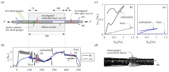 A short reinforcing bar embedded in concrete was tested in direct tension to investigate the fibre coating influence. This specimen, designated as d14c, was tested within the scope of a Master’s Project Thesis supervised by the authors [38]. Figure 3a shows the reinforced concrete (RC) specimen with a centrically placed bar made of cold-worked steel. The dimensions of the concrete were L × b × h = 300 × 150 × 150 mm3. Self-compacting concrete with a maximum aggregate size of 16 mm was used, with an average compressive strength of 38 MPa after 28 days (Sikacrete ®-16 SCC [39]). The steel bar had a nominal diameter of 14 mm. It was instrumented with an acrylate-coated and a polyimide-coated fibre optical sensor (AG and PG), respectively, both glued inside longitudinal grooves in a 180° configuration. The grooves were deliberately carved (by planning) such that they crossed the ribs at their peaks. The length of interest was 500 mm, extending 100 mm outside the concrete at both ends. The bar surface was milled over a length of 20 mm, from x = 125 to 145 mm, on opposite sides to mount two strain gauges. The strain gauges, located at a distance of 40 mm from the concrete edge, were sealed with a layer of silicone (Figure 3d). Finally, ribs were removed using a lathe to obtain a cylindrical bar along 100 mm of the embedded part, allowing to study the influence of the ribs on the DFOS data.