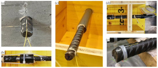 Examples of instrumenting embedded reinforcing bars with DFOS: (a) leading out the fibre with simple protection; (b) passing couplers; (c) placing an instrumented reinforcing bar in the formwork; (d) leading out the fibres with additional protection and (e) instrumentation of bar ends (anchorage).