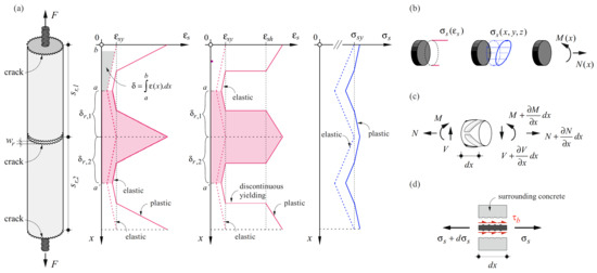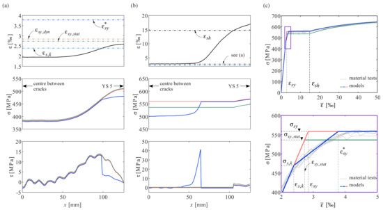 As expected, the different models hardly have any influence on the results in the elastic range, except when the strain exceeds the strain , hereafter the flattening of the blue stress–strain relationship leads to minor stresses and stress gradients (Figure 10a, middle). This leads to a drop in the bond shear stresses (blue line Figure 10a, bottom). In contrast, a significant difference results for higher strains. In the load step under consideration, the strains of the crack element exceeded the yield limits ( and ) but were, except for areas close to the crack, below the hardening strain . Using the green and red models, this leads to a plateau in the stresses (Figure 10b, middle) and therefore zero bond shear stresses (Figure 10b, bottom) over a major part of the crack element. The bond shear stresses only reappear next to the crack, where the strain surpassed the hardening limit . The results of the third model (blue lines) show a stress variation over parts of the crack element and constant values around x = 65 to 105 mm, which results in zero bond shear stresses in this part as well. The vanishing bond shear stresses, contradicting the commonly postulated bond shear stress–slip relationships, are the result of the measured gradual strain increase from the yield limit to the onset of hardening, whereas steel stresses are presumed to remain constant in this range (yield plateau).
