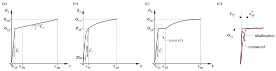 Alternatively, the model proposed by Ramberg and Osgood [43] (Figure 6b) can be employed for cold-worked (CW) steel, which lacks a yield plateau: