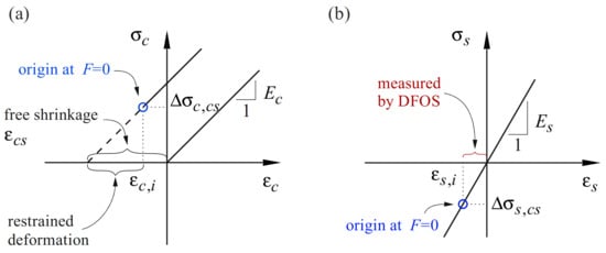 Shrinkage designates the decrease in the volume of stress-free concrete. It consists of several contributions, with autogenous shrinkage and drying shrinkage being predominant [50]. The former is the result of the chemical hydration of cement without exchange with the environment and mainly occurs in the early stage of hardening. Its value depends on the water–cement ratio and composition of the concrete. The latter, which is dominant in normal strength concrete, is caused by the loss of internal water of the hardened concrete to the environment and thus starts with the formwork removal or the end of curing. Its magnitude depends on humidity and temperature conditions as well as on the element geometry, the exposed surfaces and porosity. The total free (unrestrained) shrinkage , whose rate decreases over time, can reach values between 0.1 and 0.7‰ [51].